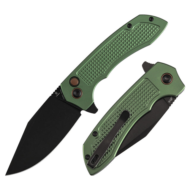 Christmas | Tenable Entity - Button Lock - 3.52'' Blackwash 14C28N - Dark Green Aluminum with Checkered Texture - Nalu Knives - B1036F2