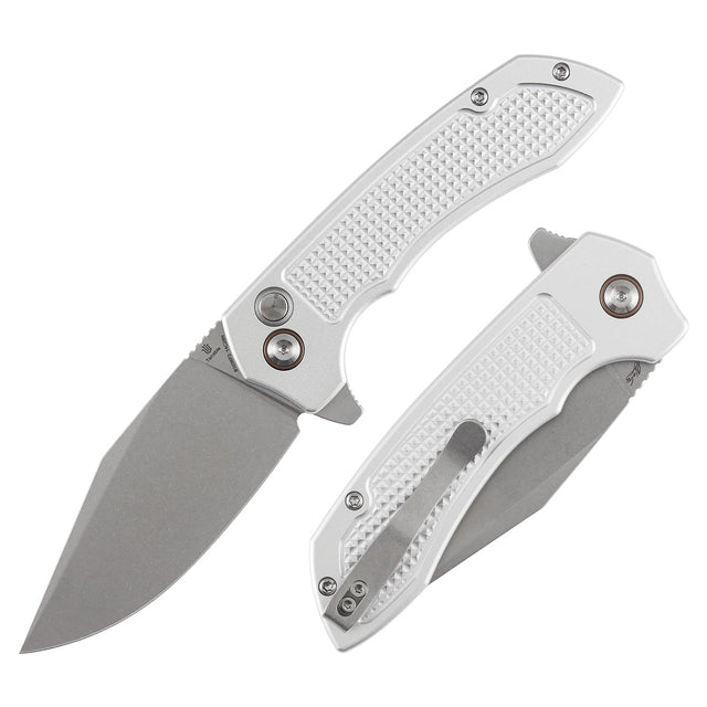 Tenable Entity - Button Lock - 3.52'' Stonewashed 14C28N - Silver Aluminum with Checkered Texture - Nalu Knives Design - B1036F3